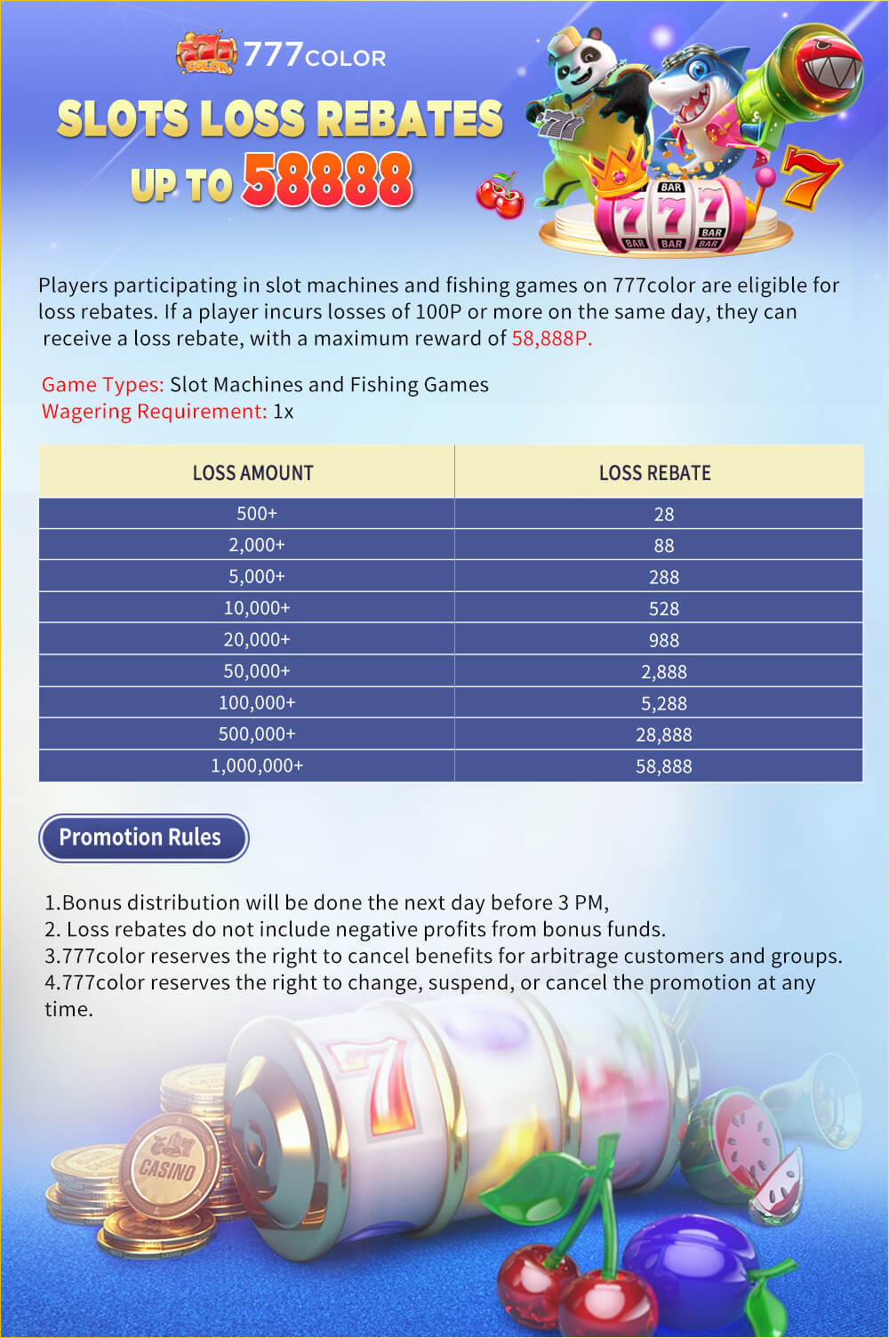 Players participating in slot machines and fishing games on 777color are eligible for loss rebates. If a player incurs losses of 100P or more on the same day, they can receive a loss rebate, with a maximum reward of 58,888P.